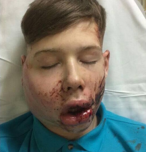 Pojken blev sparkad och slagen blodig av pojkarna från samma skola. Han var tvungen att transporteras till sjukhus med allvarliga skador på hans ansikte.